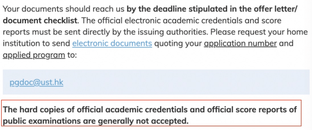 本科成绩单需由毕业院校的 中央部门(如教务处、档案室)通过官方指定安全网站,直接发送至港科大研究生院邮箱(),不接受个人发送或非官方渠道传输的材料。
