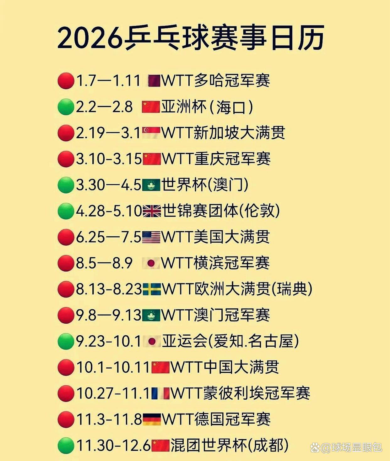 WTT2026年赛历显示,多哈冠军赛之后,2月份将接连举行果阿站和新加坡大满贯。 国乒的参赛名单采取分批公布策略,部分年轻选手将获得更多参赛机会。 00后选手林诗栋除了出战单打,还可能与周启豪搭档男双。 女队方面,蒯曼的名字出现在多哈站和果阿站两份名单中,她将身兼混双和女双两项。